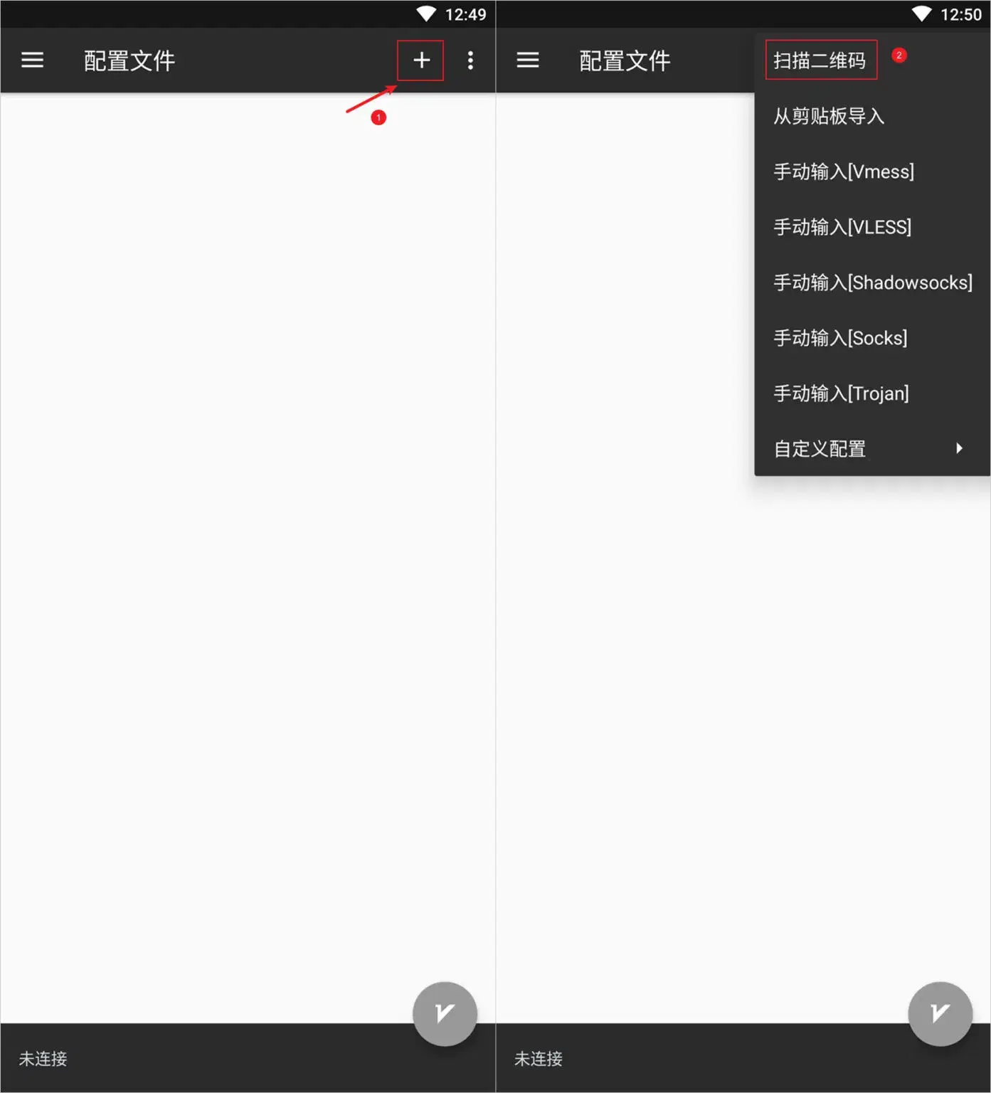 打开 V2rayNG 科学上网 APP,进入主界面,如下图所示。然后点击软件主界面右上角的 ➕ 号按钮会出现功能选项,然后选择扫描二维码。