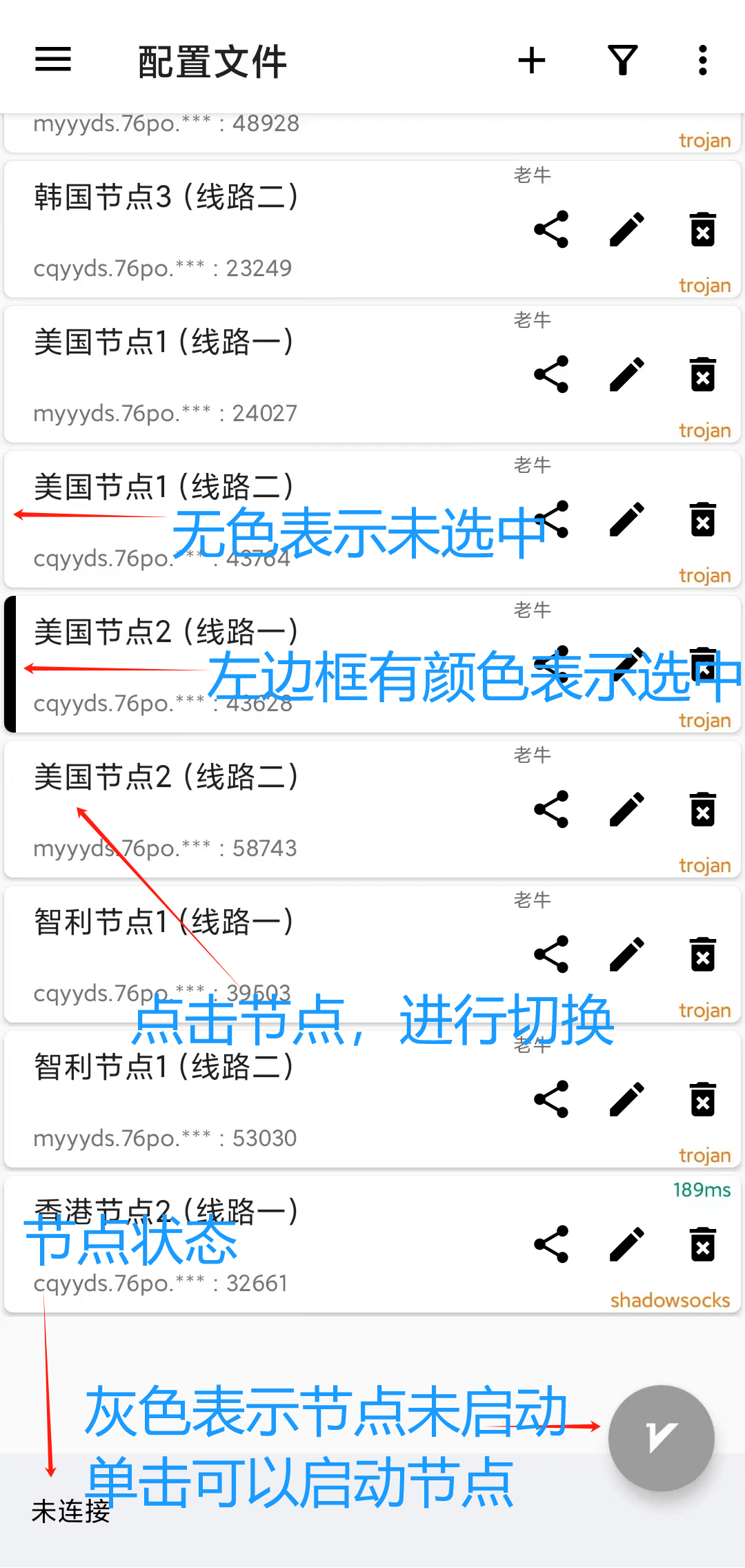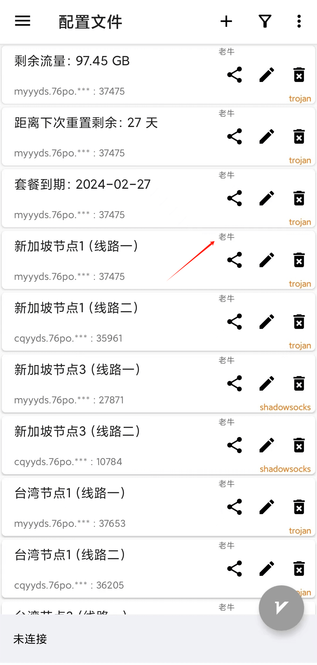 每一条代理服务器的操作都可以在这里进行,右边三个图标分别代表分享节点服务器、编辑节点服务器、删除节服务器,如下图所示。